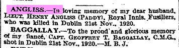 Captain Geoffrey Thomas Baggallay in Reserve of Officers killed 21/11/1920.