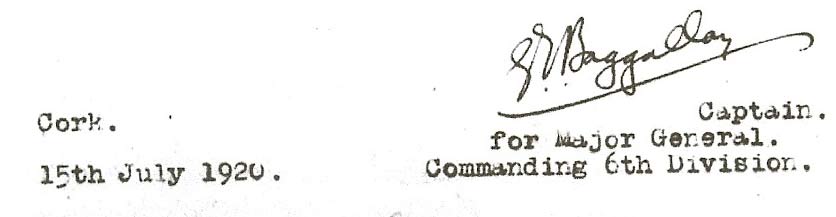 We knocked at the front door a maid came along have a letter from the Castle will you deliver this note to Captain Bagelly a one legged man. The maid pointing and in we went in. We tapped at the door, opened it and walked in. There were 3 of us. Bagelly was in bed. Lemass, Jimmy and I. I was kind of scared. ‘Captain Bagelly ?’ ‘That’s my name.’ ‘ I suppose you know what we came for. We came for you.’ He was the Judge Advocate General. ‘ I suppose you’ve come for my guns’ he said. One of us, Jimmy Brennan hid it under the bed and he reached behind for it… Slugs and a little more was our reply. ‘Get up.’ He was in pyjamas. Lemass and Jimmy and I fired 2 in the head from the 3 guns. I heard maids screaming afterwards but I was told she was alright. On the ground floor was Jack Foley. A fellow came out with a towel in pyjamas for a bath and Jack stuck him up and he was balls naked. Thinking he was a lodger but he was another British army officer and how we didn’t know about him, we hadn’t any orders about him. MacDonald took a camera and whatever papers he could find. An examination of the body found that Captain G. T. Baggally had been shot on the top of the head, through the left eye and twice in the chest