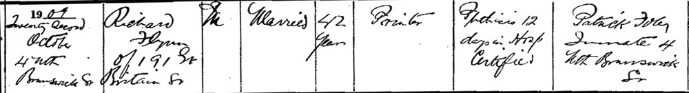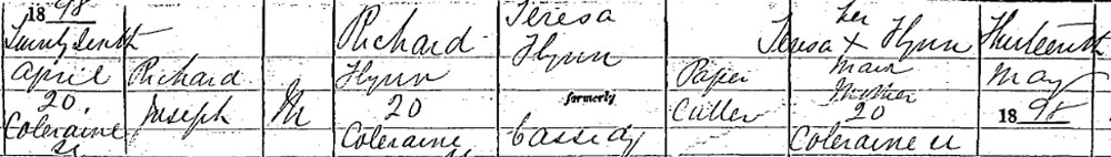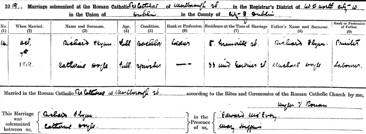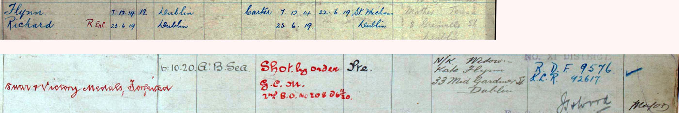 1914 Dec 7. Richard Flynn enlisted in RDF, He was a Carter. His next of kin was his mother Teresa, living at Grenville St, Dublin. When discharged in 1919 his address was 33 Mid Gardener St, where his wife Kate lived.