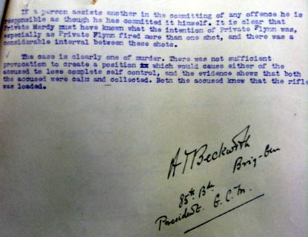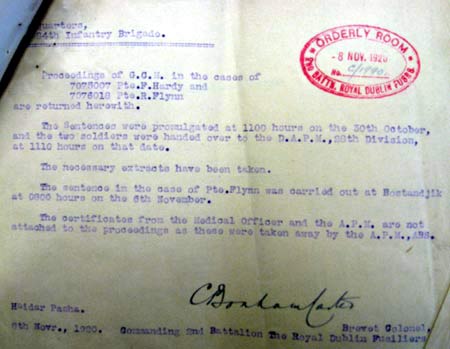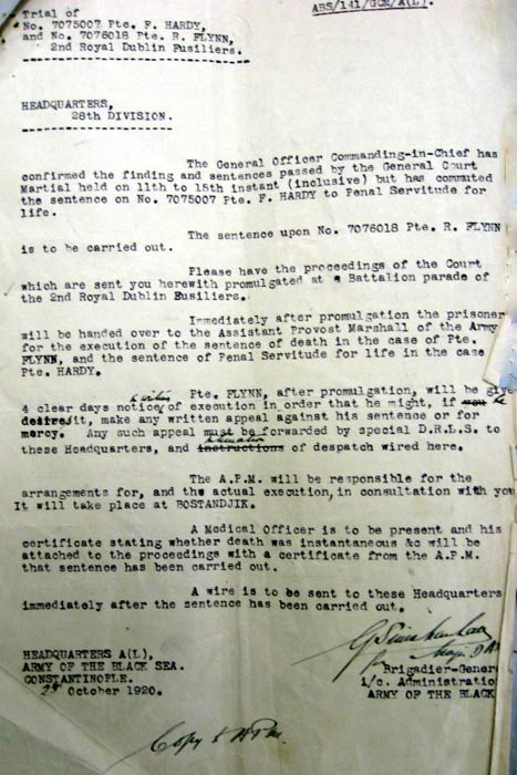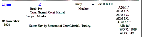Last entry in the list in Oram and Putkowski's ' Death Sentences passed by military courts of the British Army' the last soldier was Private Richard Flynn of 2nd Battalion Royal Dublin Fusiliers executed by shooting 6th November 1920 for murder in Turkey. His service number at his trial was one of the new ones that the British Army introduced, and would have been changed as every other serving soldier's was changed. However he has information about himself in National Archives ref ADM 1, 116, 137, 156, 167, AIR 18, WO 711029, 93/49. He is buried in Haidar Pasha Military Cemetery in a suburb of Istanbul between Scutari (Uskudar) and Kadikoy on the Asiatic side of the Bosphorous.WO 71/1029 refers, according to its index entry, to the court martial of R Flynn and F Hardy for murder.