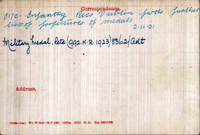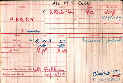 1920 Sep 22. Goes on a rampage with Pte R Flynn, in which local Turks were shot by Flynn. Flynn was sentenced to execution by firing squad, but Hardy's original death sentence was commuted to life in prison. Private Francis Hardy, 5698 and 7075007, has a medal card, which shows his MM was forfeited.