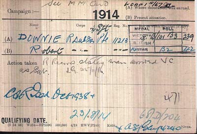 Robert Downie was born on 12 January 1894 in Laurencetown, County Down. One of sixteen children he was educated at St. Aloysius Catholic, Springburn, Glasgow. His parents were Irish, but his upbringing appears to have been in Glasgow, and it was to Glasgow that he returned after the war. He was awarded a Military Medal in 1916 in a separate engagement.